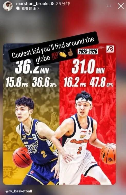 马尚布鲁克斯不久前更新社媒,他晒出的是徐杰最近两个赛季的场均数据对比。上赛季场均出场26.2分钟,能得到15.8分,3分球命中率36.6%。本赛季场均出场31分钟,得到16.2分,3分球命中率47.8%。配文写道:“你能在全球找到最酷的小子。”